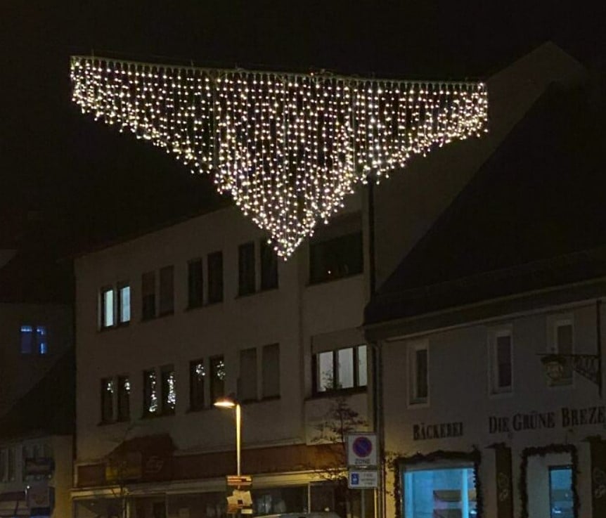 Decorated with glowing half-stars for Christmas… but now they just look like glowing underpants hanging in the sky.