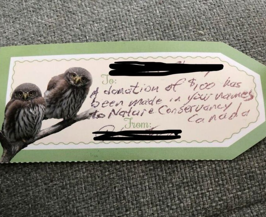The note here says: “A donation of $100 has been made in your name to Nature Conservancy Canada”.