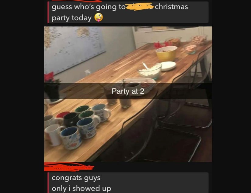 One of the guys at work invited everyone to his Christmas party… and one showed up. Really feel for him. – Reddit