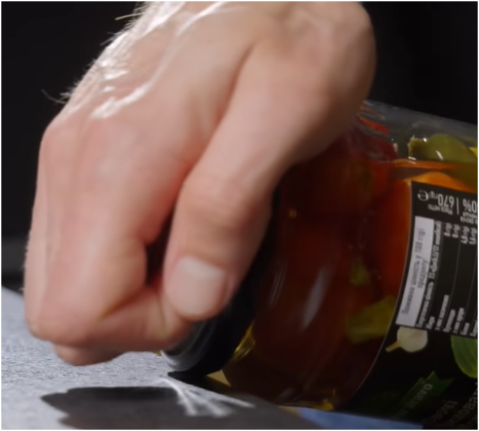 First, put your hands together, position the jar’s lid between the lower portion of your palms, and squeeze tight until you hear a pop.