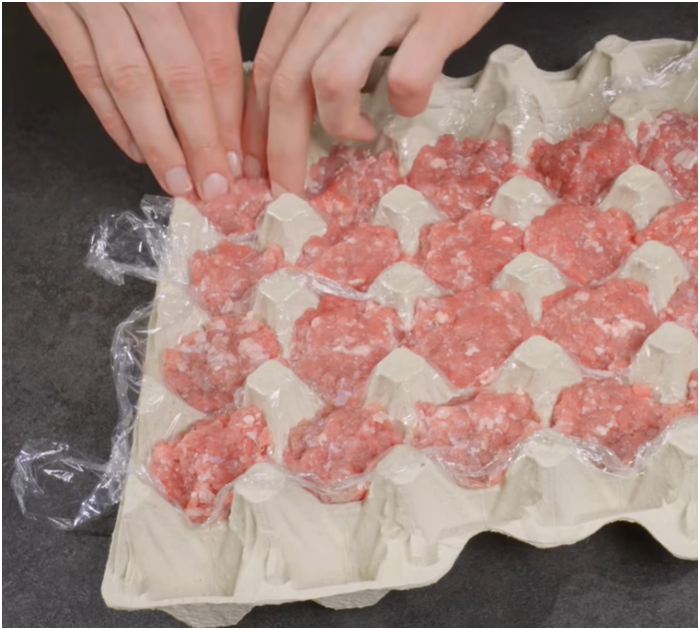 All you need is an empty carton egg tray, line it with cling wrap, and firmly shape it on the egg tray’s dimples.