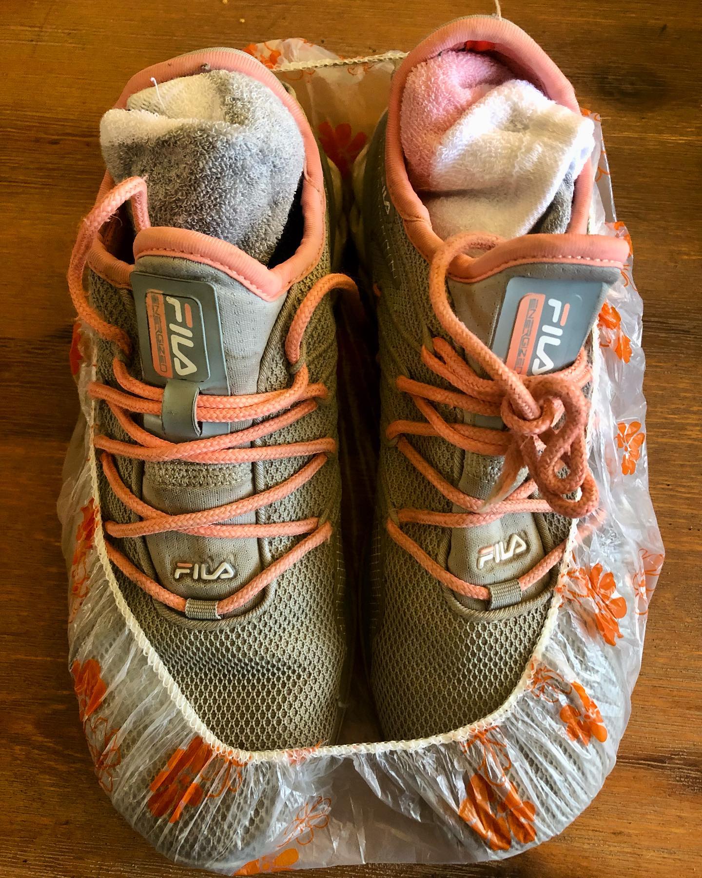 Wrap shoes in shower caps