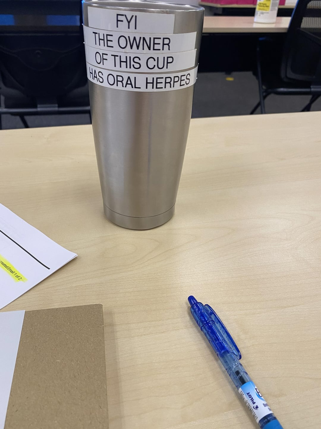 Dad came up with this in order to deter his colleagues from using his personal cup.