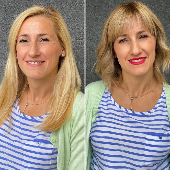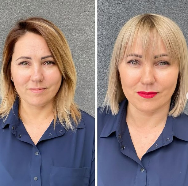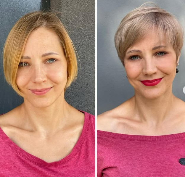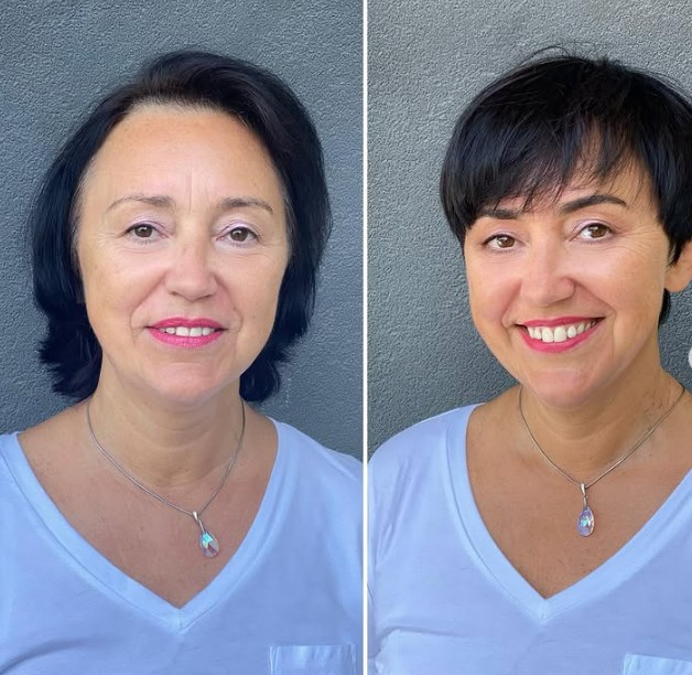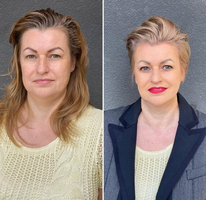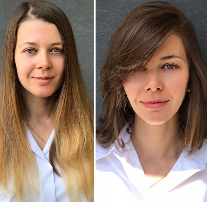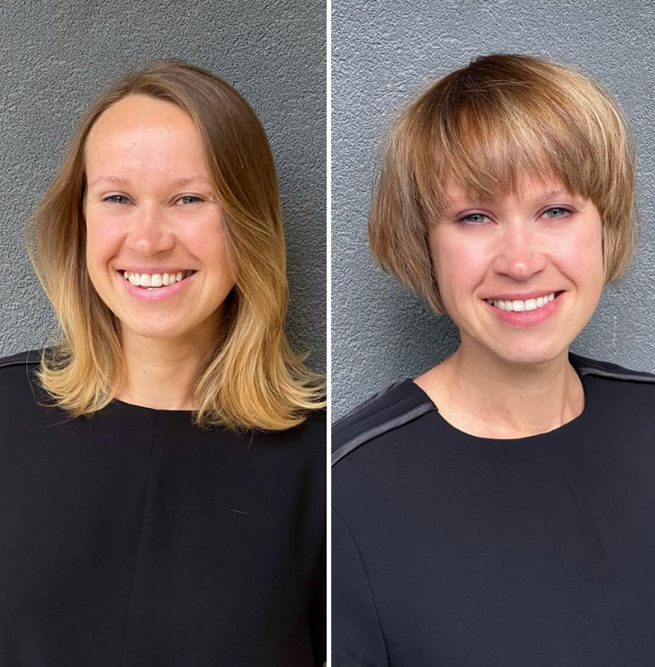 She looked a bit down in the “before” photo, but after the haircut and color change, she looks refreshed and full of life.