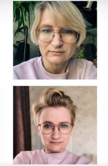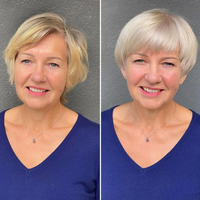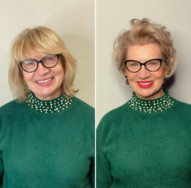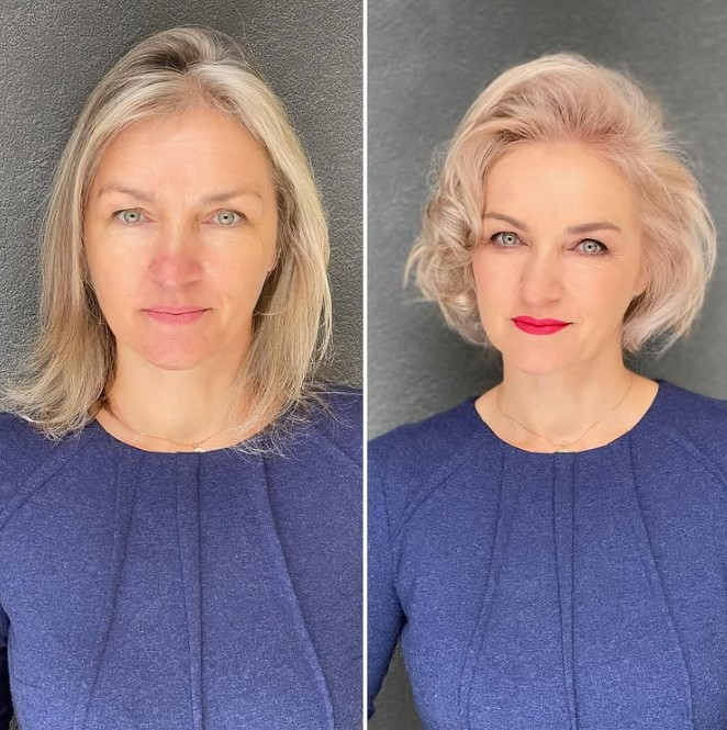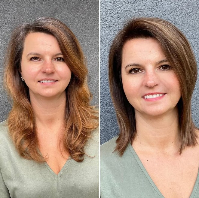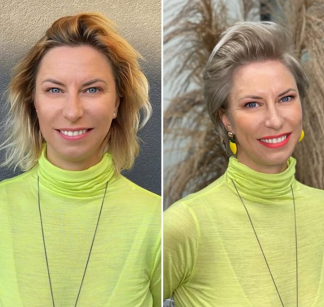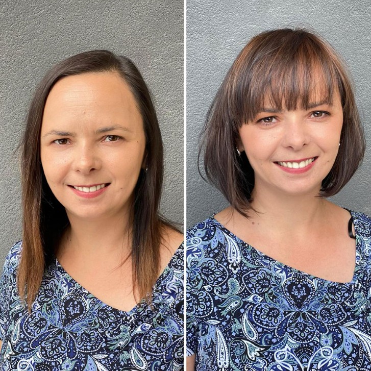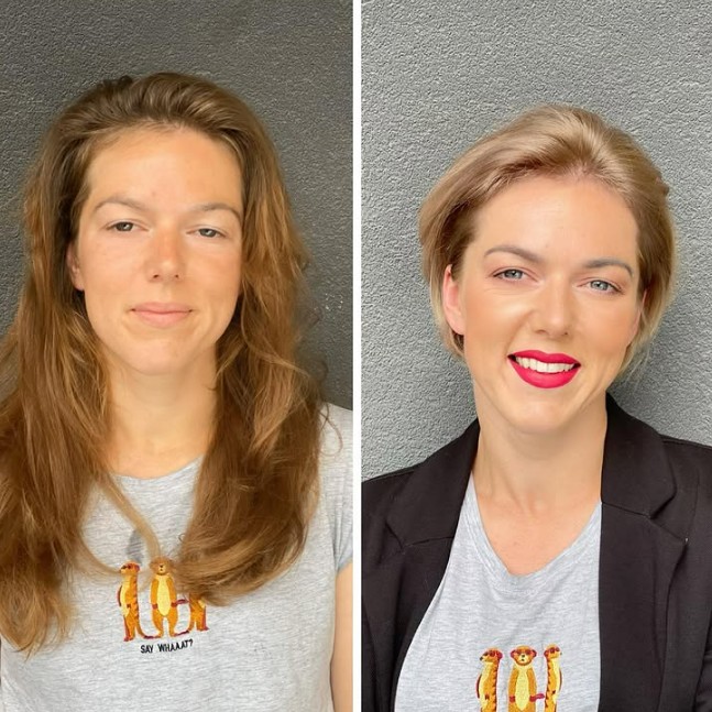 She looked a bit down in the “before” photo, but after the haircut and color change, she looks refreshed and full of life.