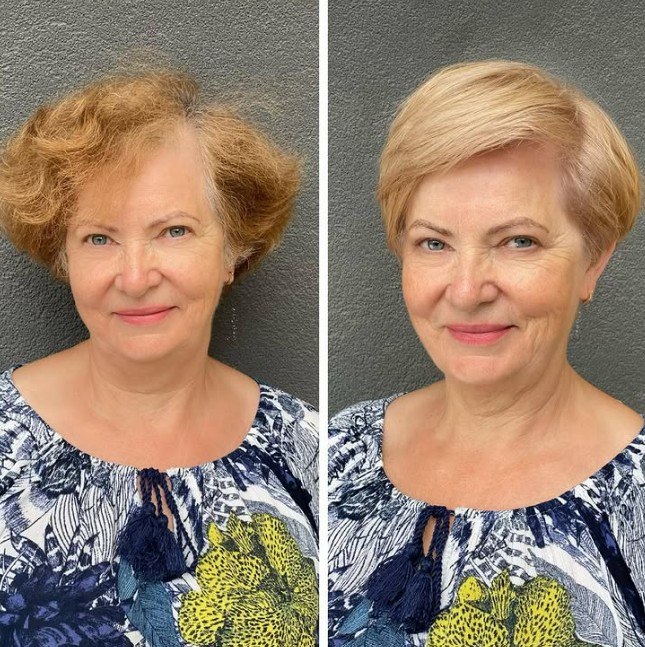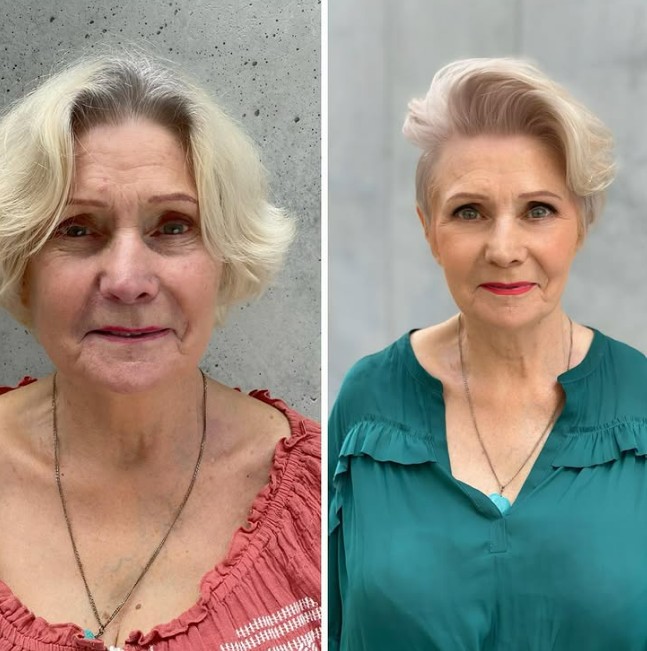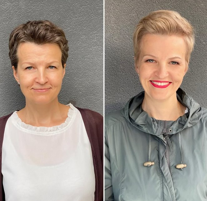 From thin, wispy strands to a chic pink pixie cut, she now looks elegant, fabulous, and decades younger. Her eyes sparkle, and her whole look radiates confidence!
