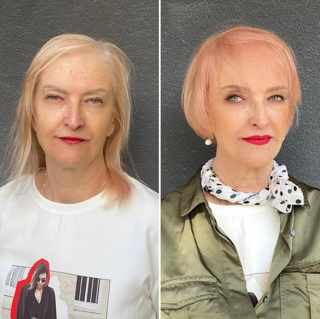 Before her transformation, she had that sweet grandma vibe—warm and ready to listen. But with her chic haircut and a hint of pink in her hair, she now looks like a confident CEO ready to lead the next big meeting!