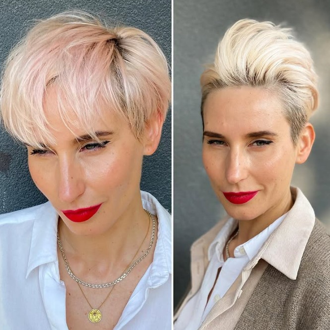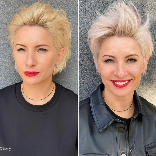 She already looked stunning in the “before” photo, but the blonde, brushed-up style enhances her features even more. Just wow!