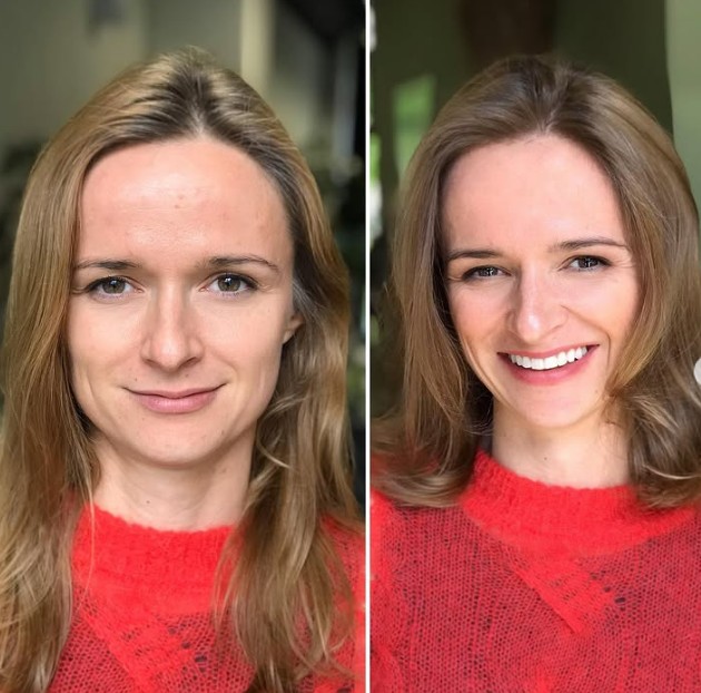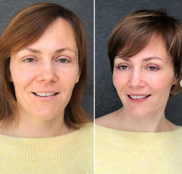 She looked pretty in her “before” photo, but a bit older. After her haircut and lighter makeup, she transformed into a chic, youthful woman!