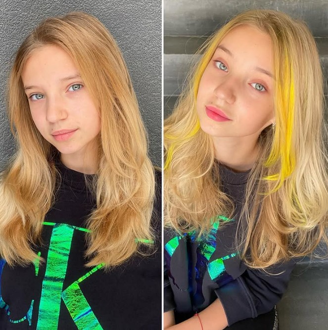 A haircut can bring big changes, but a color transformation can be just as powerful. This young lady’s bright yellow highlights are bold—and surprisingly perfect for her!