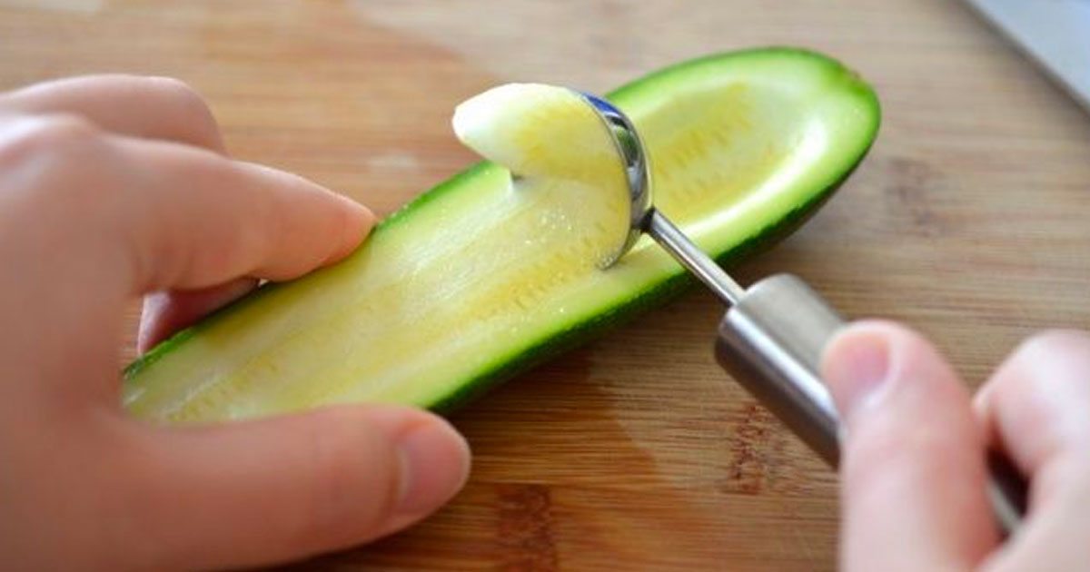 Easily remove seeds from fruits and vegetables, such as watermelon, cucumber, and zucchini, by using a small ice cream scoop or melon baller. The curved surface of the scoop keeps the seeds inside of it while the scoops edge allows you to cut through the most fibrous innards.