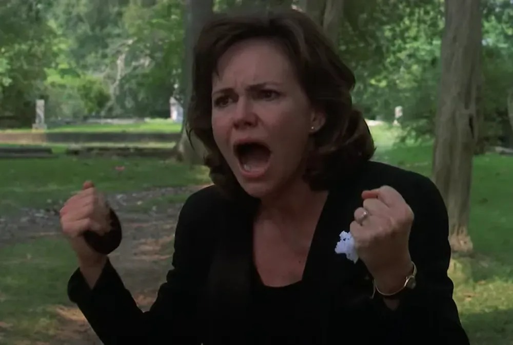 During her daughter’s funeral, M’Lynn delivers a gut-wrenching and realistic performance that captures the complex emotions of grief, anger, confusion, and sadness that accompany such profound mourning.