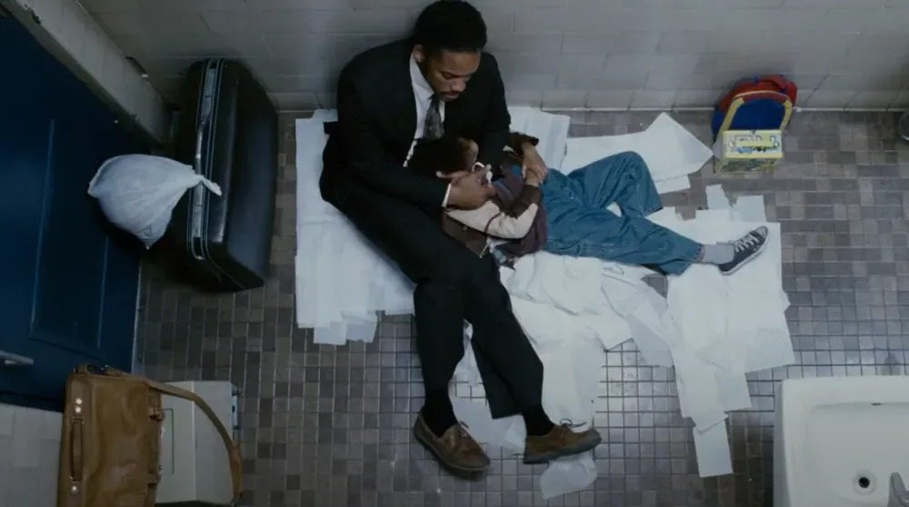 Chris and Christopher sleep in a bathroom in The Pursuit of Happyness (2006)