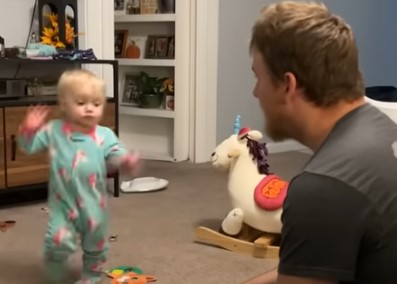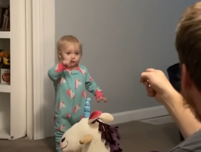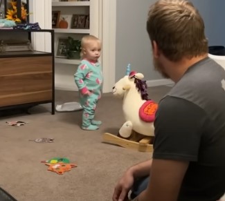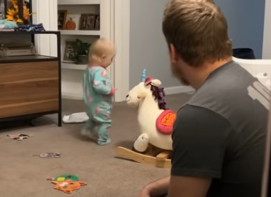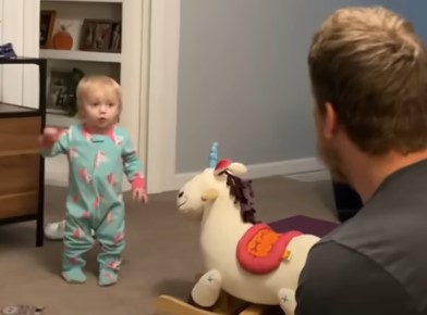 In the video, Elena, wearing adorable unicorn pajamas, approaches her father who is sitting on the living room floor.