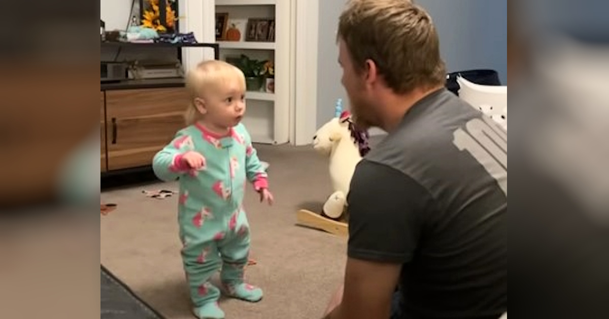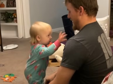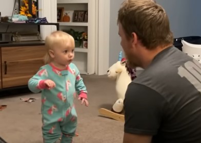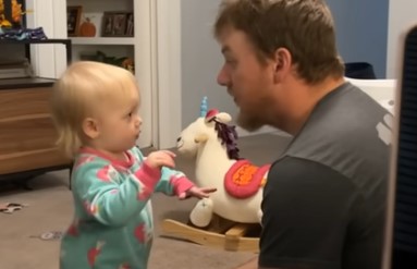 She babbles to her dad and then turns to leave, but not before Dad calls out, “What’d you say?”