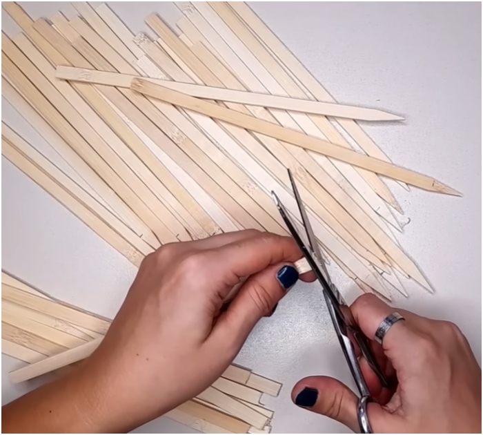 Step 1: Grab one skewer and remove its pointed part, do this to at least 38 skewers (as shown in the video) and use that as the base height for all.