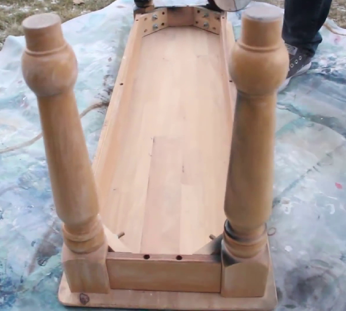 Here, she sanded the bench a bit to make the paint stick and used black spray paint. She cautioned not to use high-gloss or flat paint because it won’t have the same effect.