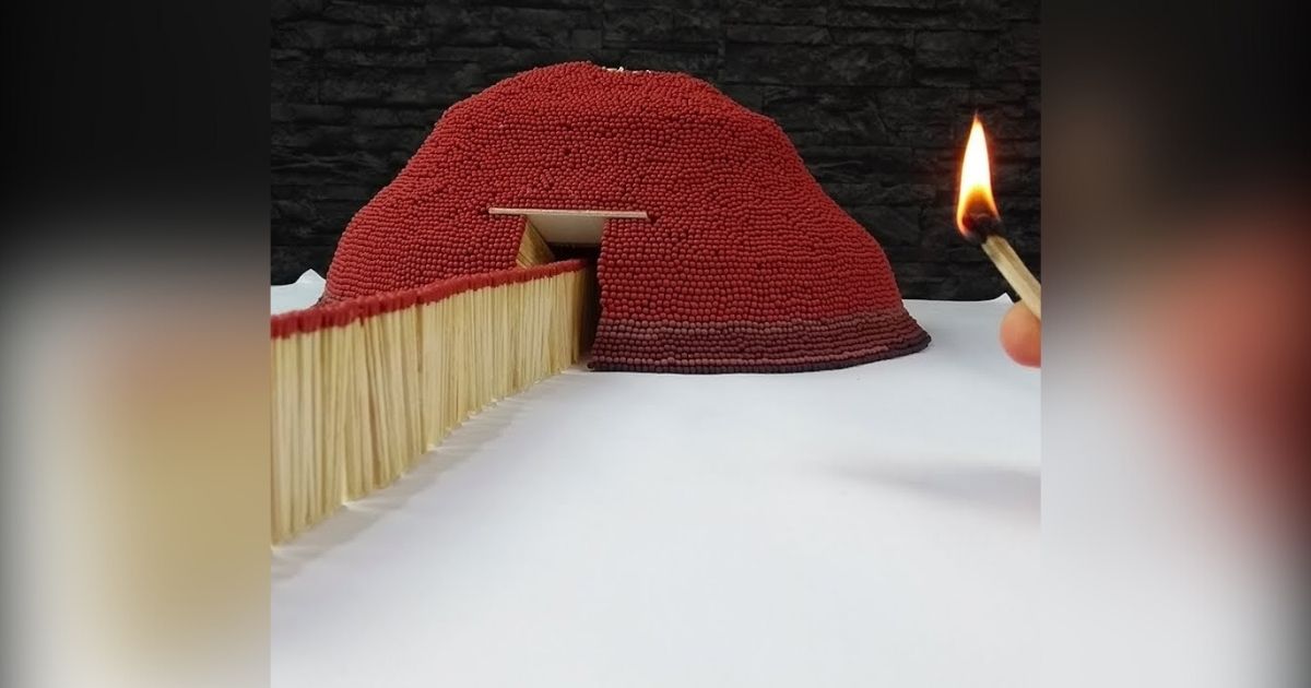 In this video, Mokso builds a volcano entirely out of matches before lighting it and creating an epic eruption.