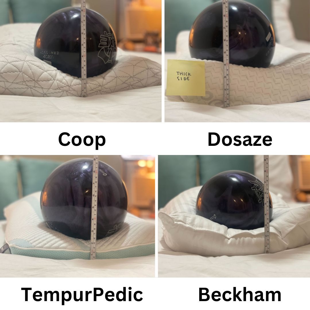 Since the average human head weighs roughly 4.5 kilos, we used a 10-pound bowling ball to test how much support each pillow would provide. Here’s what we found.