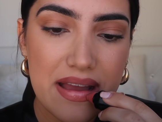 The most important tip she gives about overlining is that you should not take overlining all the way to the sides of your lips. You basically just overline the center of the upper and lower lip and then, as you’re moving to the sides, you follow the natural line of your lips.